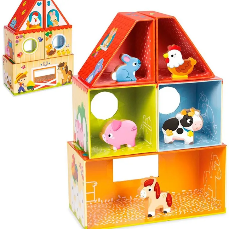 Juego con el que los más pequeños de la casa podrán construir su primera granja apilando las piezas de diferentes maneras. En el interior encontrarás las figuras de una gallina, una vaca, un caballo, un cerdito y un conejo. Recomendado a partir de 1 año.