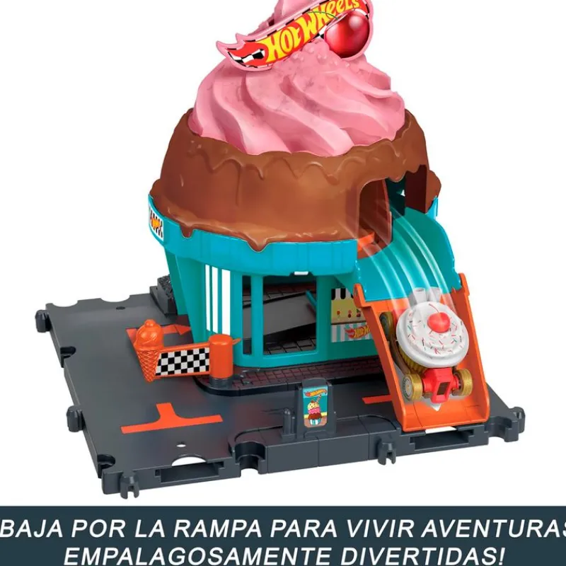 Entra en la heladería de Hot Wheels, gira la espiral de fresa para mover el coche por la heladería. Incluye un delicioso vehículo Hot Wheels con una escala de 1:64. Cuando llega a lo más alto, el coche arranca automáticamente en busca de nuevas aventuras. Recomendado a partir de 4 años.