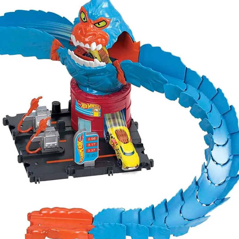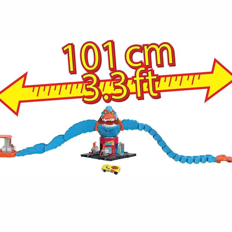 Gorila Gary de la colección Hot Wheels ¡Se ha apoderado de la gasolinera y quiere comerse a todos los vehículos! Lanza uno de tus vehículos a través de sus brazos y la boca para evitar ser comidos. Los brazos del gorila son flexibles y se pueden ajustar para aumentar el desafío. Podrás conectar el brazo a otras pistas de la colección (NO INCLUIDO/SE VENDE POR SEPARADO). Incluye coche Hot Wheels. Recomendado a partir de 4 años.