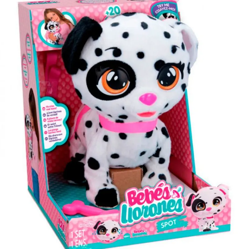 Llega el adorable cachorrito de la colección Bebés Llorones, el perrito Spot. ¡La mascota de la simpática Dotty que te acompañará a todas partes! Camina y llora con lágrimas reales, para que deje de llorar deberás darle su hueso. Viene acompañado de una correa para que puedas pasearlo. Reproduce más de 30 sonidos y reacciones. Funciona con 3 pilas AA incluidas (pilas de demostración). Recomendado a partir de 3 años.
