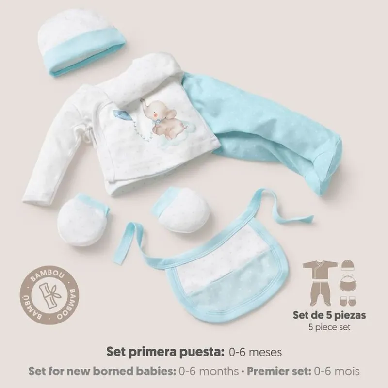 Set de nacimiento 5 piezas con animalitos ideal para hacer un regalo de 0-6m, formado por un babero, una camiseta cruzada, unos pantalones con pies, un gorro y unas manoplas.