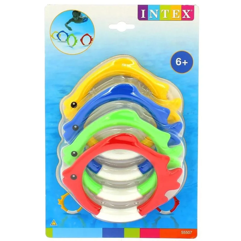 Conjunto de 4 aros con los que podrás jugar en la piscina ¡Podrás pasarlo en grande con tus amigos mientras jugáis a buscarlos en el fondo de la piscina/playa! Los aros tienen la graciosa forma de pez y son de diferentes colores. Fabricados en un material resistente y flexible. Miden 12 cm de diámetro. Recomendado a partir de 6 años.
