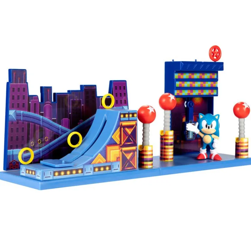 Playset Studiopolis inspirado en el famoso personaje de videojuegos Sonic. Este playset dispone de una rampa deslizante para que Sonic pueda correr y conseguir los anillos. También encontrarás muelles articulados. Contiene la figura de Sonic, articulada en algunas partes de su cuerpo y con un tamaño de 6 cm aproximadamente. Recomendado a partir de 3 años.