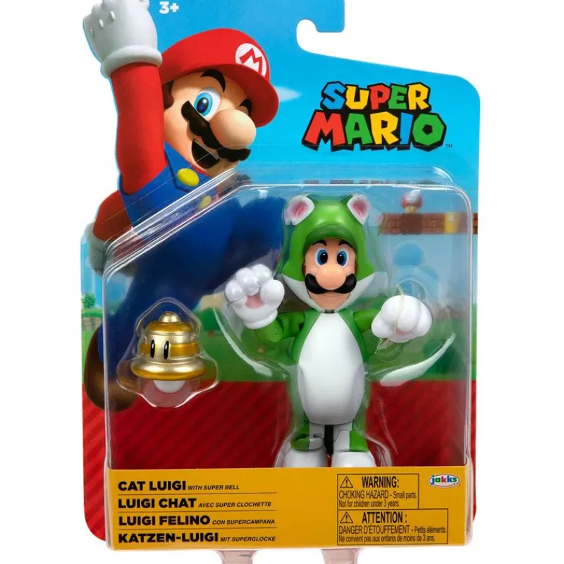 Figura de Luigi, uno de los personajes principales de la saga de videojuegos Super Mario. Su diseño tiene forma de gato, una de las muchas transformaciones del personaje. Tiene un tamaño de 10 cm y además es una figura articulada. Viene acompañado de un cascabel. Recomendado a partir de 3 años.