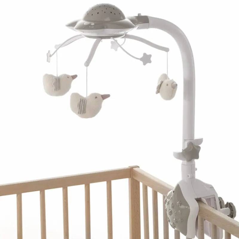 Carrusel que se adapta a todas las cunas incluso a las de viaje. Proyecta imágenes en el techo para ayudar al bebé a relajarse y conciliar el sueño gracias a sus colores suaves que cambian al ritmo de la música. Con varias melodias, lo puedes plegar para utilizarlo de proyector de mesa.
