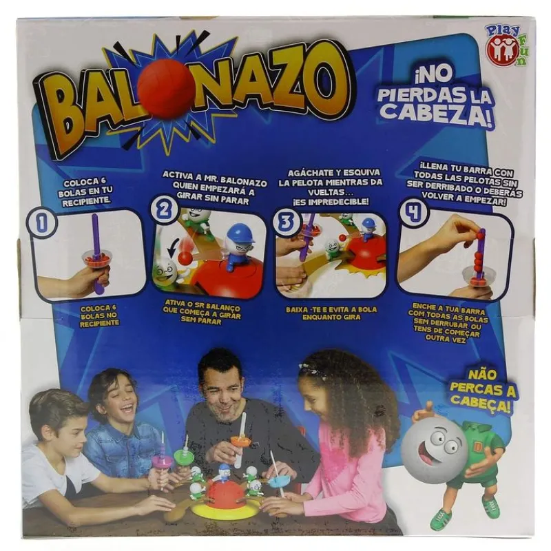 Balonazo es un juego de habilidad en el que debes intentar llenar tu barra con todas las pelotas rojas antes que el resto de jugadores y, a la vez, evitar que la figura situada en el centro de la base de juego derribe la cabeza de tu personaje. Si la cabeza de tu personaje es derribada por alguna de las bolas, deberás vaciar tu barra y volver a empezar desde cero. El modo de desarrollo del juego es sencillo: primero debes colocar seis bolas en tu recipiente, después debes activar a Mr. Balonazo para que el juego empiece y, por último, debes intentar esquivar las pelotas que van a la cabeza de tu personaje, a la vez que intentas llenar tu barra de pelotas. El primer jugador que consiga completar su barra ganará la partida. Edad recomendada a partir de 6 años. De 2 a 4 jugadores.