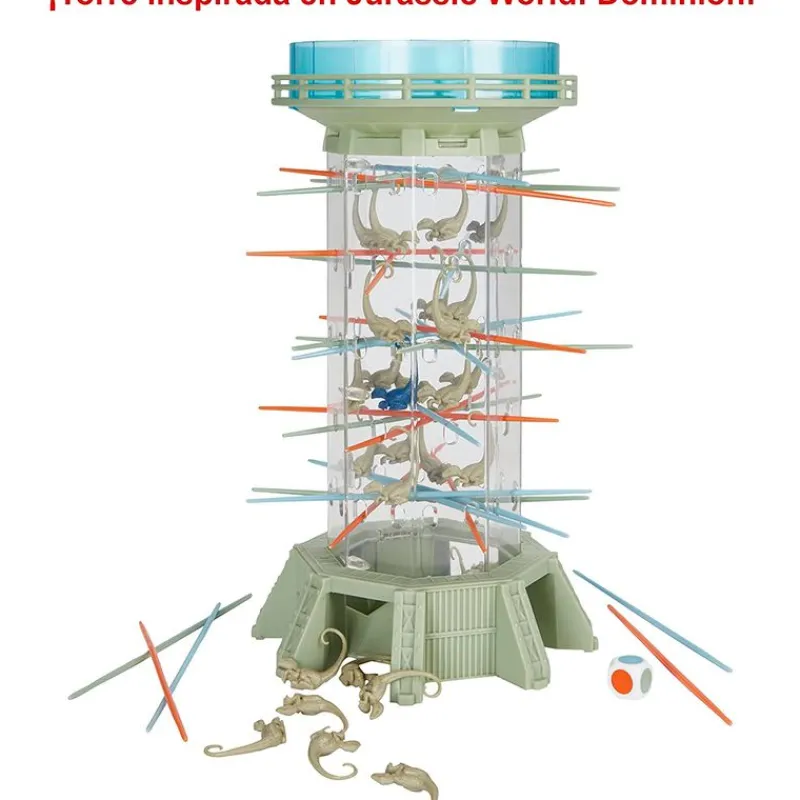 Clásico juego de Monos Locos ahora con el diseño inspirado en la película Jurassic World Dominion ¡No dejes que los dinosaurios se escapen! Los velociraptores se colocan en la torre, los jugadores deberán sacar un palito por turno, intentando que los dinosaurios no se escapen de la torre. En esta edición encontrarás una regla exclusiva, existe la pieza especial de Beta, el primer jugador que la haga caer podrá volver a colocar 3 velociraptores de su pila en la torre. De 2 a 4 jugadores. Recomendado a partir de 5 años.