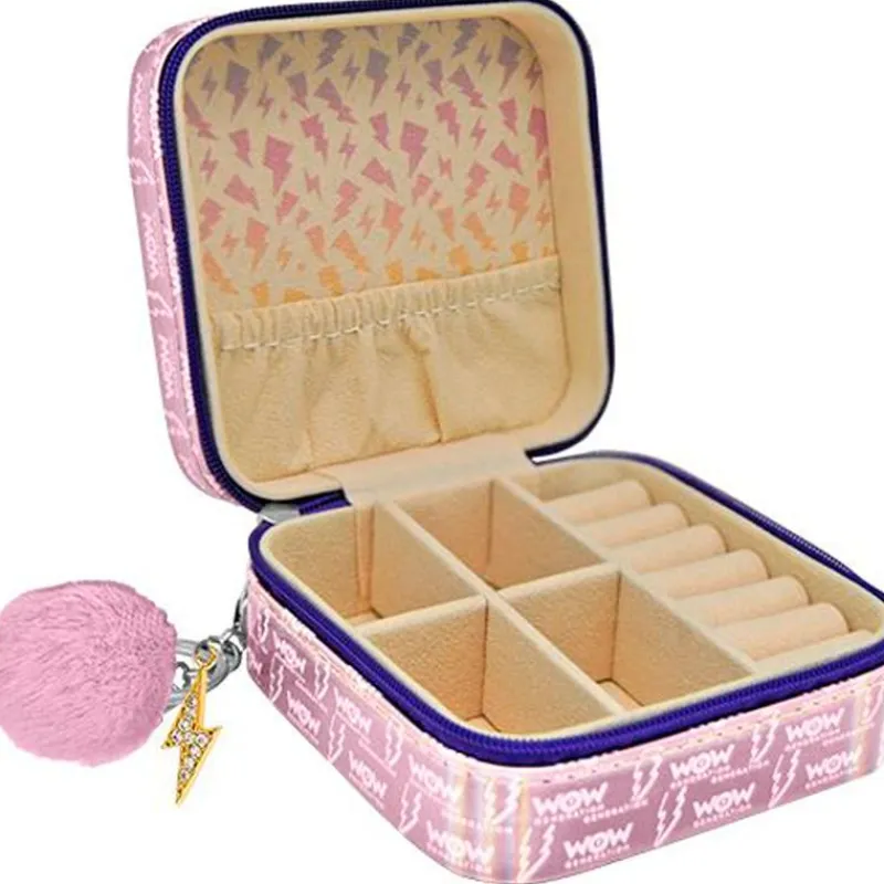 Joyero de viaje para que las más pequeñas de la casa puedan ir siempre acompañadas de sus accesorios de bisutería u joyas. Con un montón de compartimentos diferentes. Las dimensiones del joyero son de 10 cm x 10 cm x 5 cm aproximadamente.