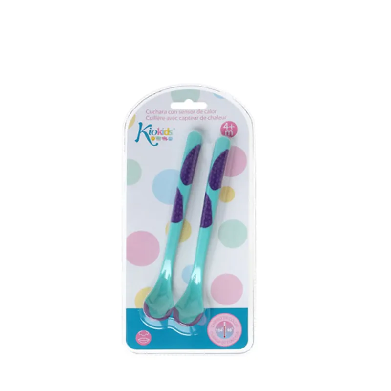 Si queremos controlar la temperatura de ingesta de las primeras papillas o purés que damos a nuestros hijos, el set de 2 cucharas de silicona con sensor de calor de Kiokids nos facilita esa función, al incorporar un dispositivo que ante una subida por encima de los 40ºC cambia de color avisándonos de que está caliente.