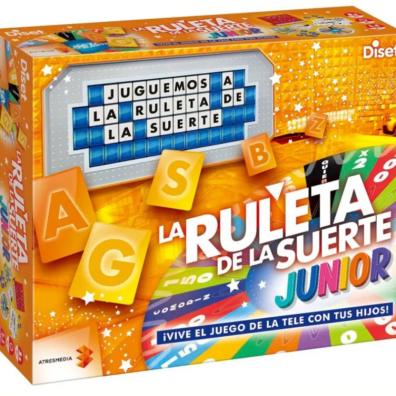 Juego de mesa inspirado en el famoso programa de televisión ‘La Ruleta de la Suerte’. El objetivo principal del juego es ganar dinero girando la ruleta y resolviendo los enigmas que encontrarás detrás del panel ¡Gira la ruleta, busca las consonantes del panel, compra vocales y resuelve! El jugador que haya ganado más dinero tras 4 rondas será el ganador. En el interior encontrarás un panel de enigmas, 120 enigmas, billetes de dinero, fichas comodín, una pizarra de letras, un rotulador borrable y un libro de instrucciones. De 2 a 4 jugadores. Recomendado a partir de 8 años.