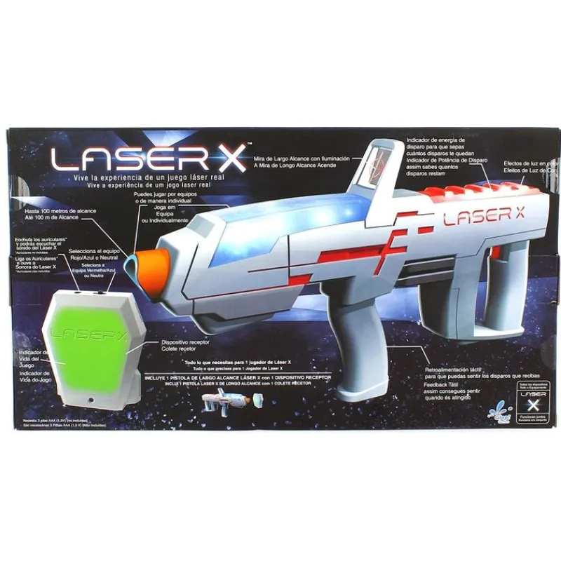 ¡Increíble pistola laser con la que podrás recrear alucinantes batallas! Con esta pistola podrás disparar a tus rivales a larga distancia ¡Alcanza hasta 120 metros! Incluye un receptor. Dispone de características como efectos de luz, indicador de vidas e indicador de vibración cuando te alcanza un oponente. Funciona con 3 pilas AAA NO incluidas. Recomendado a partir de 6 años.