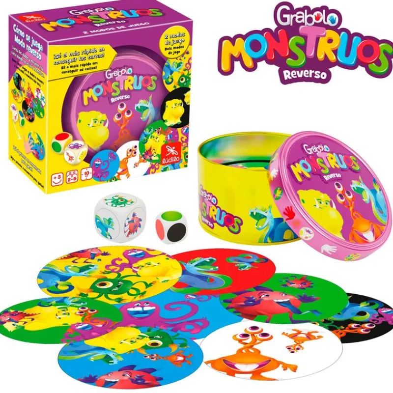 Tira los dados, que te darán una combinación de monstruo y color. Busca la carta con la combinación de monstruo y color que indican los dados o la carta de color que indican los dados o la carta del color que indica un dado y en la falta el monstruo que indica el otro dado, según con que cara de cartas estés jugando. De 2 a 5 jugadores. Recomendado a partir de 3 años.