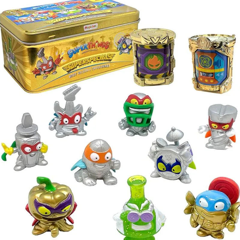 Lata Gold Superspecials de la colección Supethings ¡Consigue los 9 Supethings exclusivos de la serie 2! En el interior encontrarás al Professor K (ultrararo), Candy Strike y PumpKing (dorados), Turbo Twist, Super Riff, Rocketball, Headstrong, Lord Twister y Beatcrush. Además es una oportunidad única para conseguir las 2 guaridas doradas de héroe y villano.