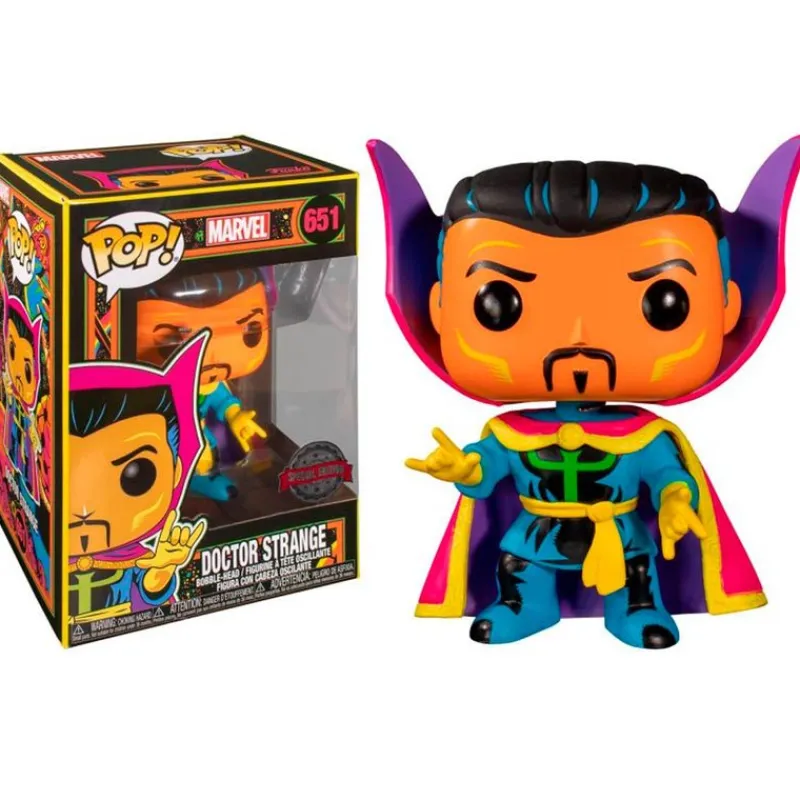 Figura fabricada en vinilo de la colección Funko POP con número 651 , inspirada en el famoso personaje de Marvel, el superhéroe Doctor Strange, La figura es una edición especial Black Light, le da un efecto neón que brillará bajo luz negra. Su tamaño es de 10 cm aproximadamente. Recomendado a partir de 3 años.