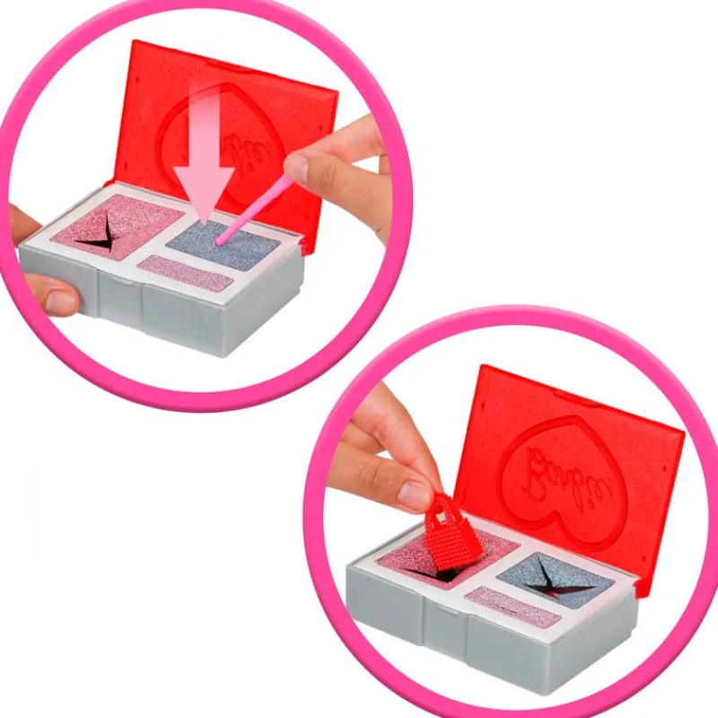 Sigue abriendo los “regalos” misteriosos para descubrir más sorpresas escondidas en un estuche. ¡Perfora cada sección con la brocha de maquillaje incluida para descubrir complementos de moda para la muñeca Barbie!