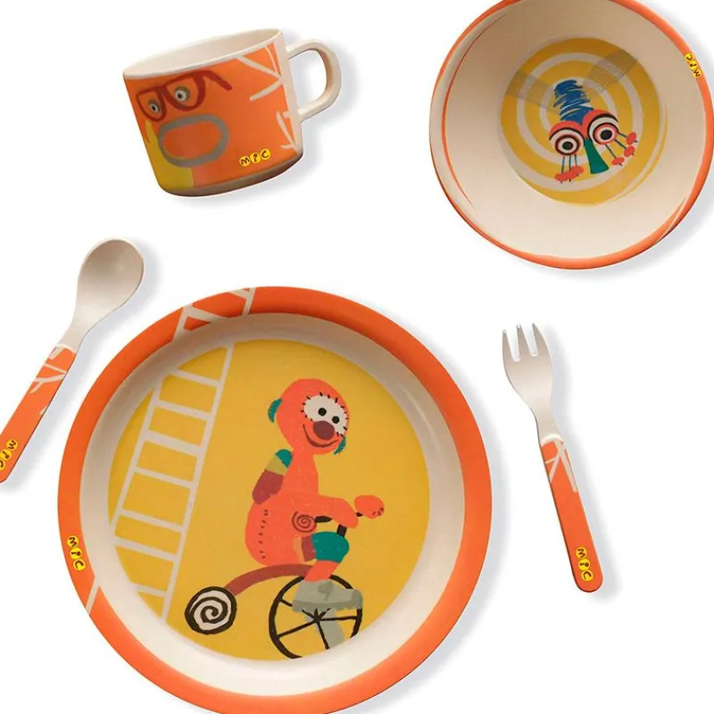 Vajilla con diseños inspirados en el personaje de TV3, Mic. El Pack contiene un plato, una taza, una cuchara, un tenedor y un cuenco. Libre de BPA, fabricada en melanina, almidón y papel de celulosa. APTO para lavavajillas, NO apto para microondas. Recomendado a partir de 4 meses.
