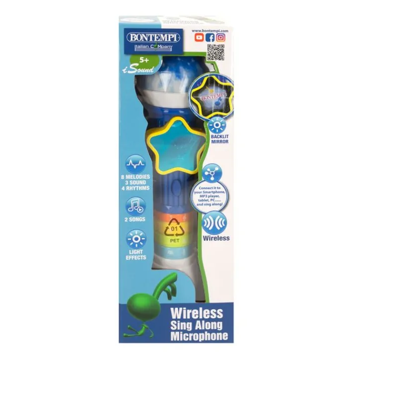 Micrófono electrónico luz y sonido.Cuenta con 8 melodías,3 sonidos,4 ritmos y 2 canciones.Tiene luces de colores para integrarse más al juego.Se puede conectar al smartphone,MP3,tablet,PC…