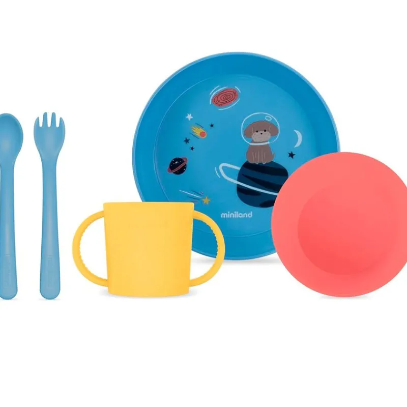 Vajilla infantil de 5 piezas: plato, cuenco, taza con 2 asas, cuchara y tenedor.