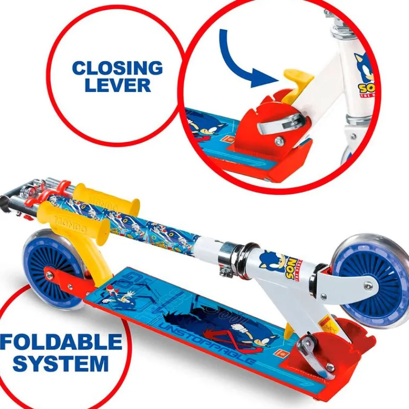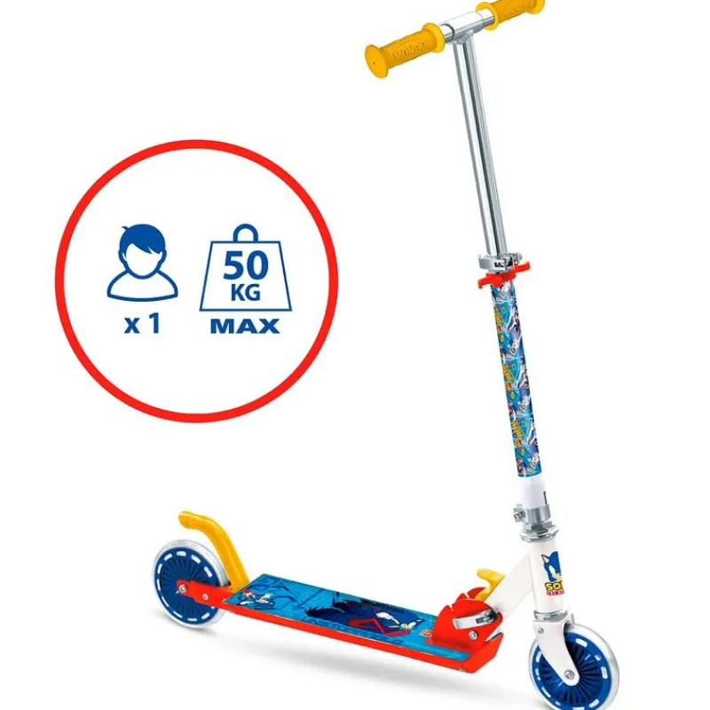 Patinete de 2 ruedas, fabricado en aluminio, con llamativos diseños inspirados en el videojuego Sonic. Dispone de freno en su parte trasera y es plegable. Su manillar es ajustable en altura de 68 cm a 77.5 cm aproximadamente. Soporta un peso máximo de 50 kg. Recomendado a partir de 5 años.