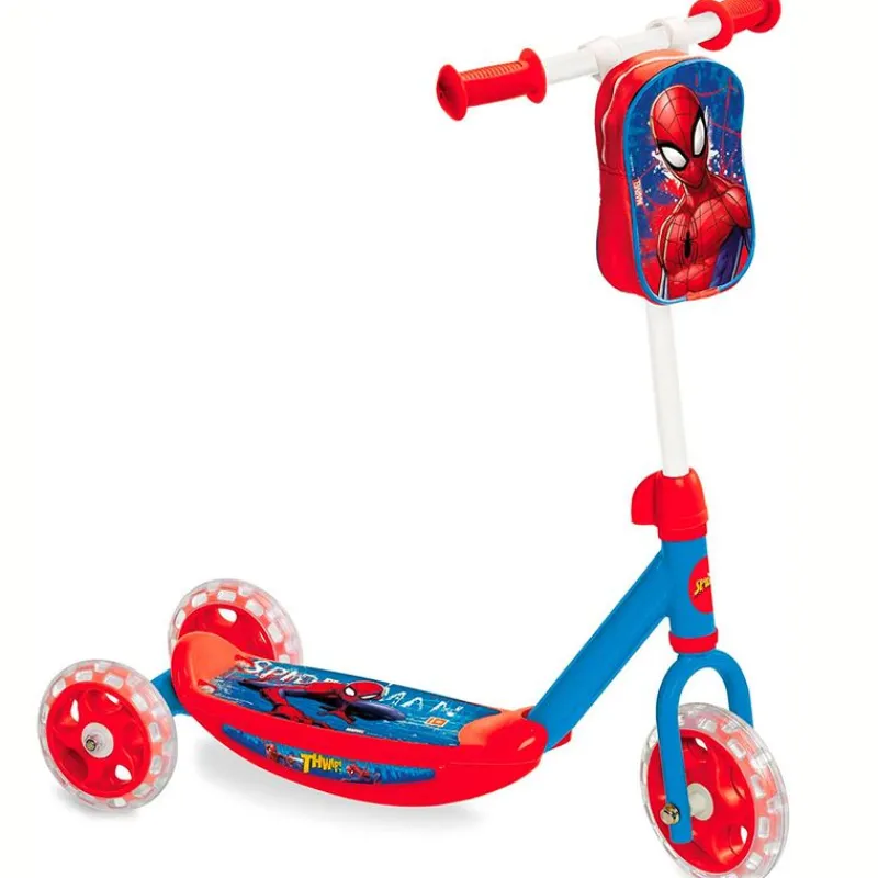 Patinete de 3 ruedas con diseños inspirados en el famoso superhéroe Spiderman. La altura del suelo al mango es de 59 cm en su máxima altura. Incluye una bolsa de almacenamiento para que puedas llevar contigo pequeños objetos. Las ruedas están fabricadas en PVC. Soporta un peso máximo de 20 kg.