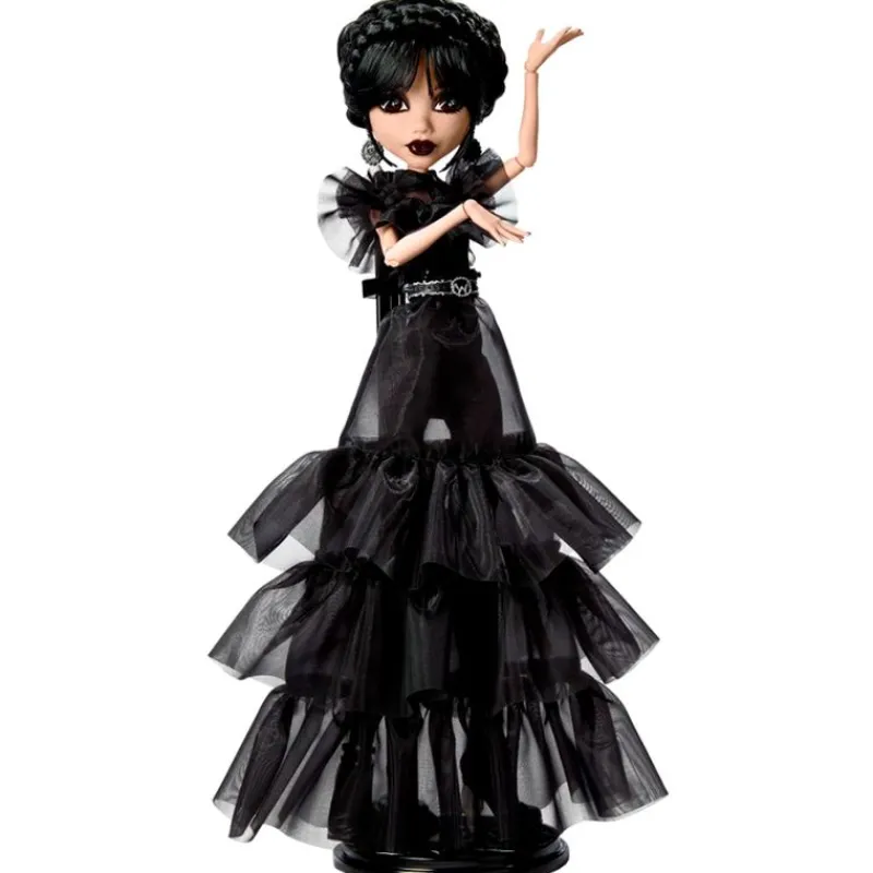 Espectacular muñeca de la colección Monster High inspirada en Miércoles Addams, con el conjunto con el que aparece en la serie de Netflix que lleva su nombre.