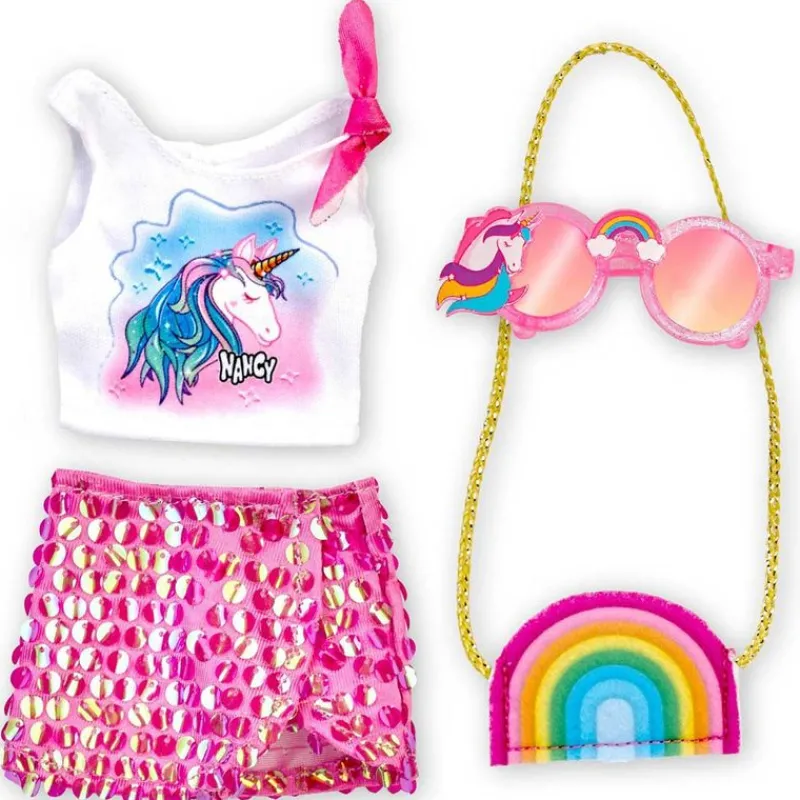 Pack de la colección Nancy en el que encontrarás un outfit inspirado en unicornios. Contiene una camiseta con un unicornio, una falda de purpurina fucsia, un bolso con forma de arcoíris y unas gafas reflectantes. Recomendado a partir de 4 años.