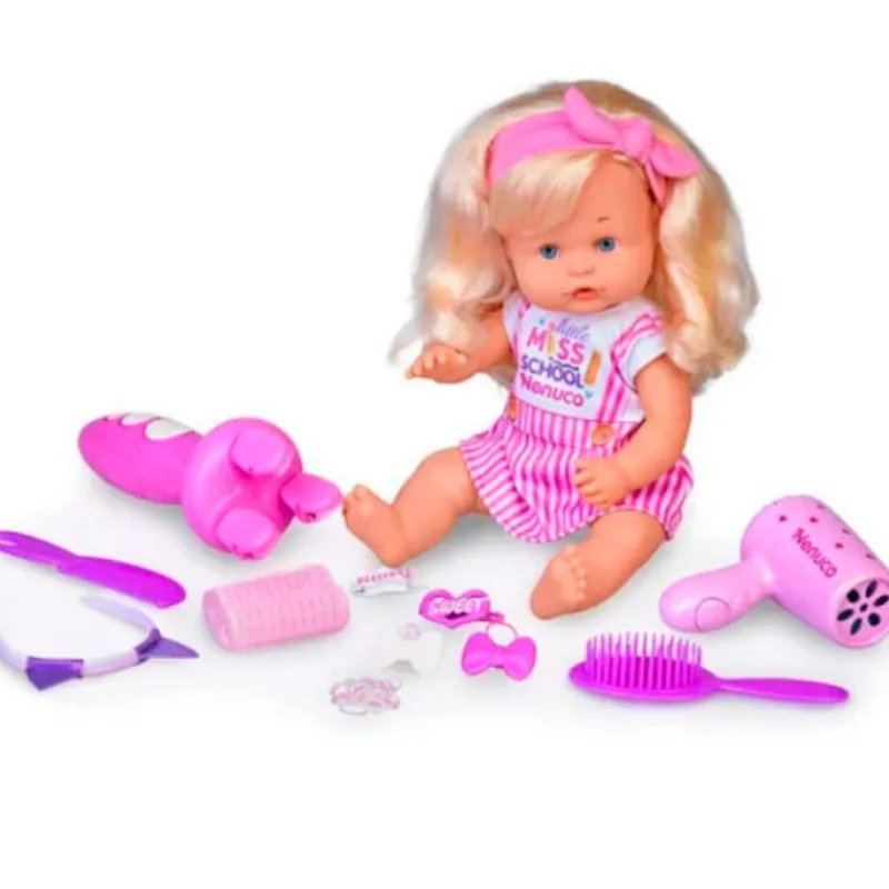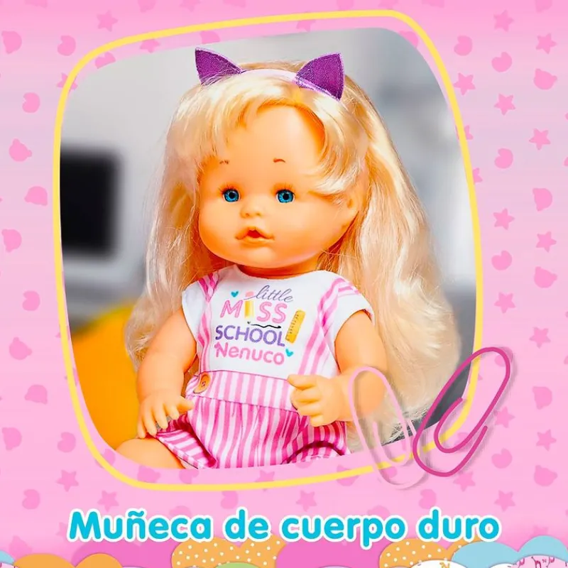 Nenuco es una adorable muñeca bebé con pelo largo a la que podrás hacer un peinado diferente para cada día de la semana. Viene acompañada de más de 10 accesorios de peluquería entre los que encontrarás un secador, un trenzador de pelo, horquillas, una diadema y gomas. Su tamaño es de 35 cm aproximadamente y su cuerpo es duro. Recomendado a partir de 3 años aproximadamente.