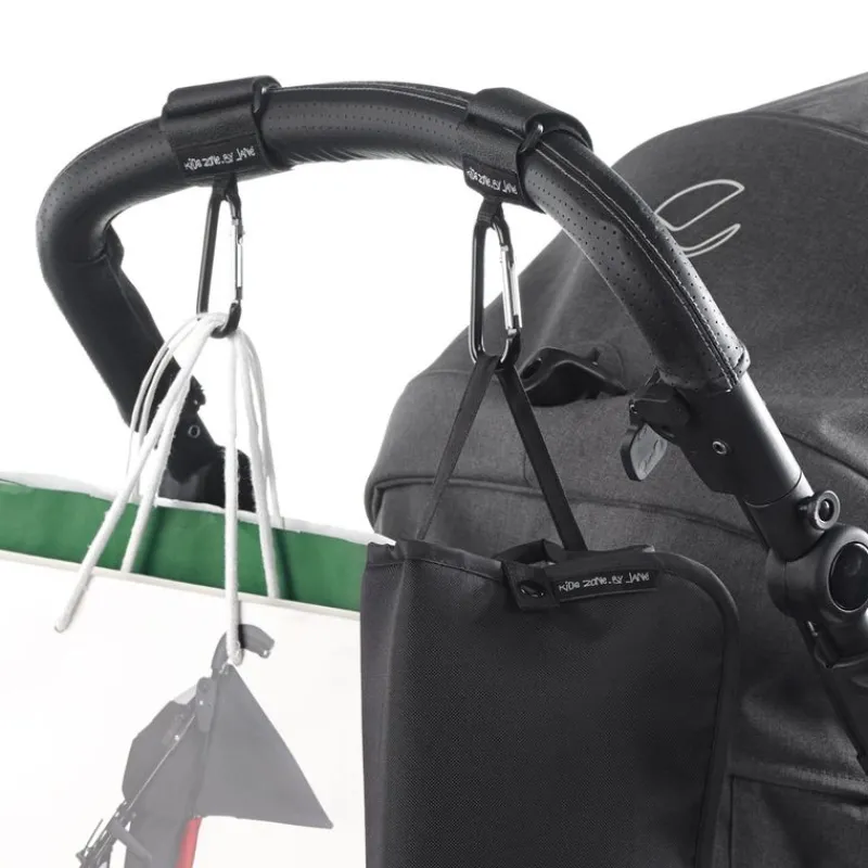 2 mini mosquetones con correas universales para poder adaptarlo a todos los cochecitos de bebé o todas las sillitas de paseo. Podrás llevar las bolsas cómodamente mientras conduces el cochecito.
