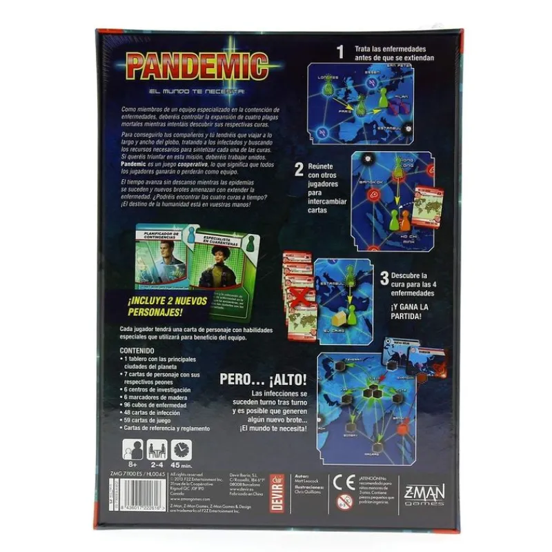 Contiene un tablero con las principales ciudades del planeta, 7 cartas de personaje con sus respectivos peones, 6 centros de investigación, 6 marcadores de madera, 96 cubos de enfermedad, 48 cartas de infección, 59 cartas de juego, cartas de referencia y las instrucciones de juego.