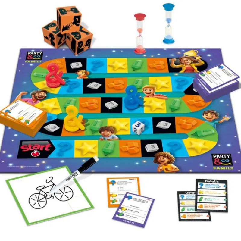 En el interior encontrarás 2 tableros en 1, 2 tipos de preguntas para niños y para adultos con 300 tarjetas, 3 cubos de fiesta, una pizarra, un rotulador borrable, 2 relojs de arena y 3 peones.