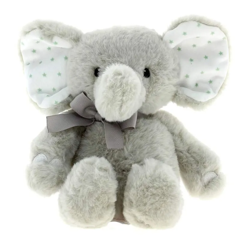 Tiene el característico color gris del animal, decoraciones de estrellitas en sus orejas y un gran lazo a conjunto.