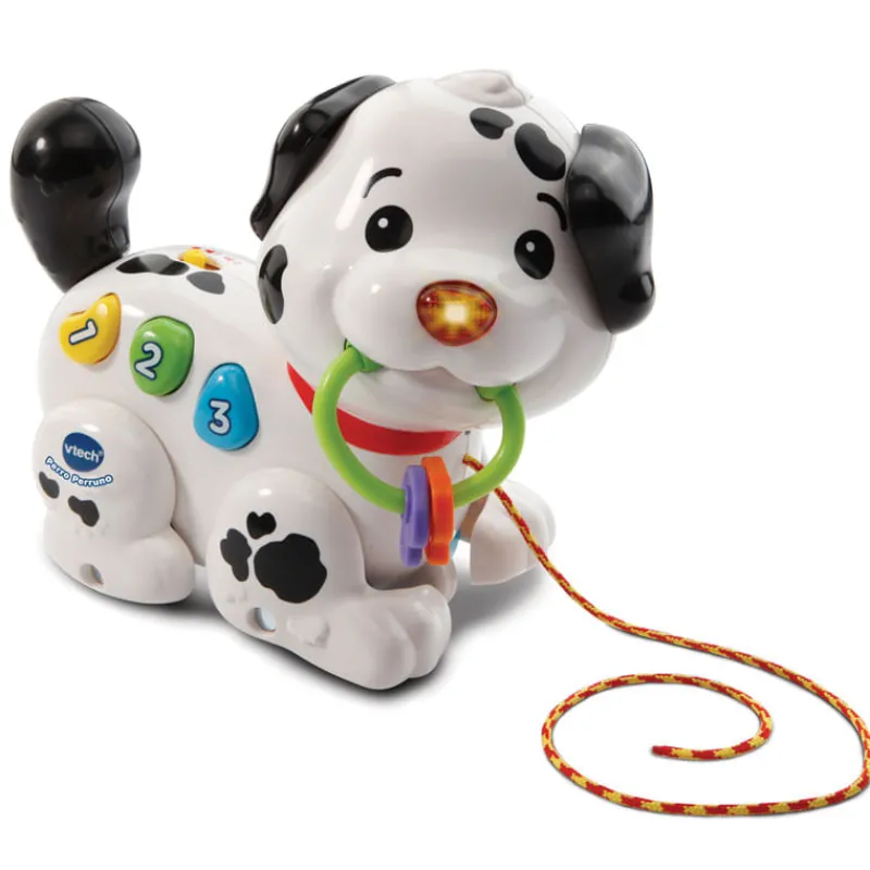 Perrito interactivo para llevar de paseo. Es un juguete de arrastre, y cuando el bebé tira del perrito, sus patas se mueven y se activan frases, sonidos y melodías. Tiene tres botones en el cuerpo del perrito para descubrir los número, los colores y activar melodías y en la boca dos elementos para que sean manipulados por el bebé.