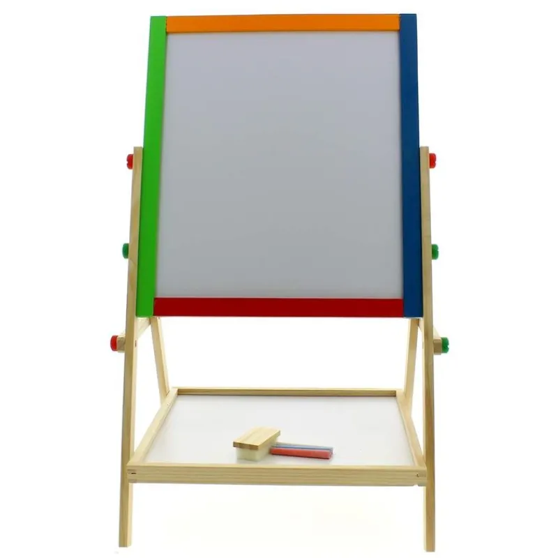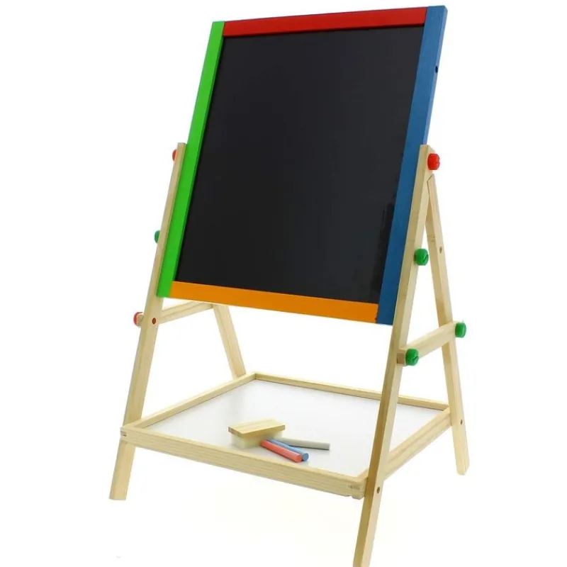 Pizarra de madera 2 en 1 con altura regulable. Por una parte se puede escribir con tizas y por la otra con rotuladores vileda. Incluye tizas y borrador.