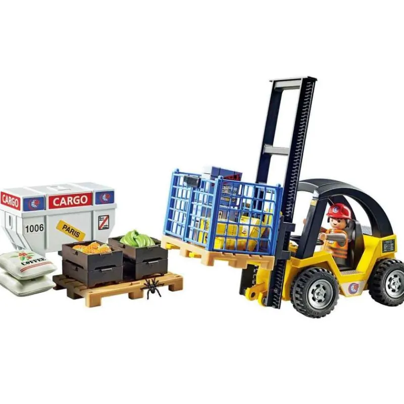 Carretilla Elevadora de la colección Playmobil My Life. Ayuda al trabajador del muelle a transportar la mercancía. Al ajustar, los tenedores de la carretilla pueden adaptarse a diferentes cargas como paletas, contenedores o cajas de malla de alambre. La carretilla se puede subir y bajar usando el botón giratorio. Recomendado a partir de 4 años.