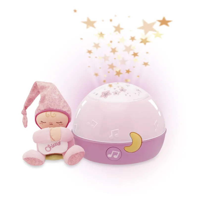 Este proyector Buenas Niches Estrellita de Chicco crea una atmosfera idónea para el descanso: las estrellas proyectadas y la dulce música de fondo facilitan el sueño del recién nacido y le relajan para conciliar bien el sueño. Las melodías de Bach, Rossini, las piezas New Age y los sonidos de la naturaleza, se suceden en una selección ideal, brindando al pequeño la oportunidad de acercarse, por primera vez, a la magia música. Este proyector se puede utilizar, también, como lámpara coloreada, y cuenta con 2 efectos de luz (ambiental o multicolor), peluche extraíble y tiempo de funcionamiento de música de 6 minutos.