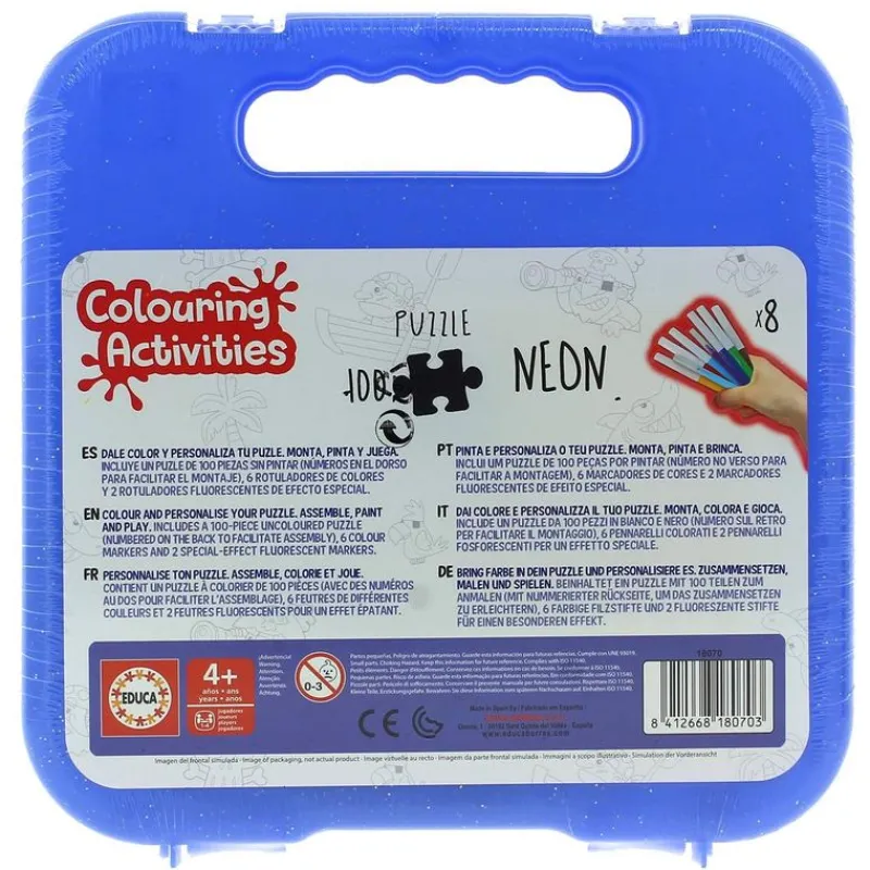 Divertido pack con el que podrás montar un puzzle, compuesto de 100 piezas, inspirado en el mundo de los piratas ¡Podrás pintarlo tu mism@ con colores! En el interior encontrarás 8 rotuladores de diferentes colores neón. El tamaño del puzzle montando es de 28 cm x 40 cm aproximadamente. Recomendado a partir de 4 años.