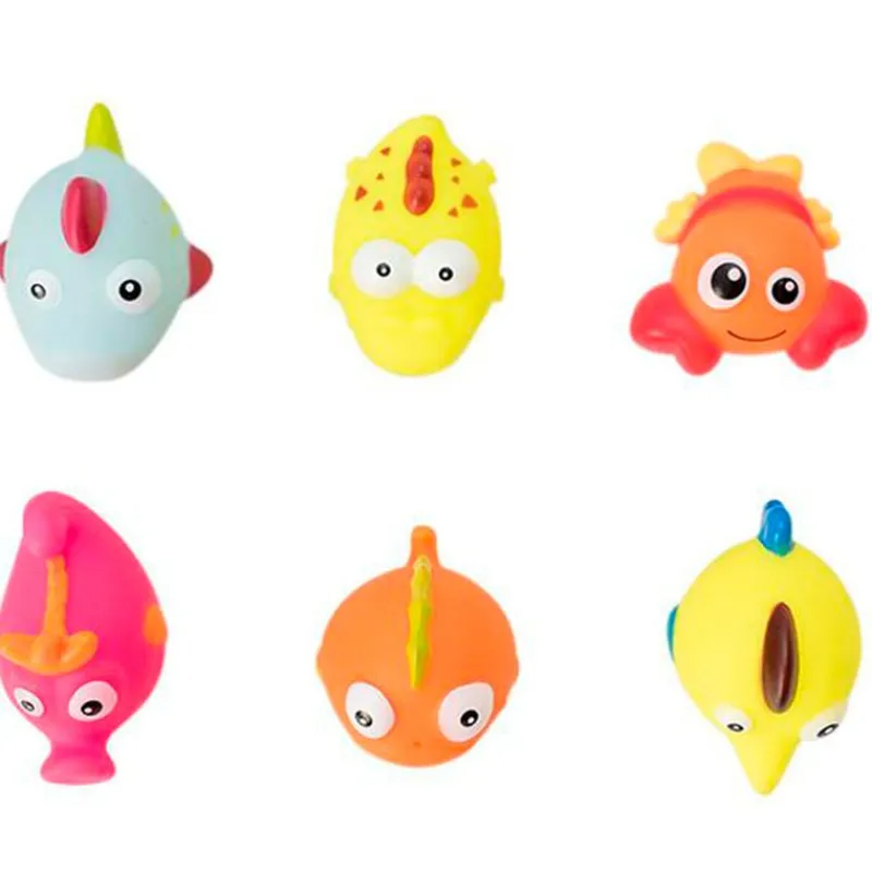 Divertido pack de 6 muñecos de baño de animalitos de playa, con colores muy alegres y de varias formas que ayudará al bebe a desarrollar sus habilidades cognitivas a la vez que juega