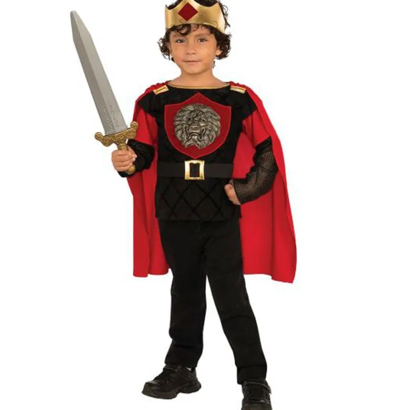 Disfraz compuesto de una camisa con capa y un cinturón. NO contiene espada, corona ni calzado.