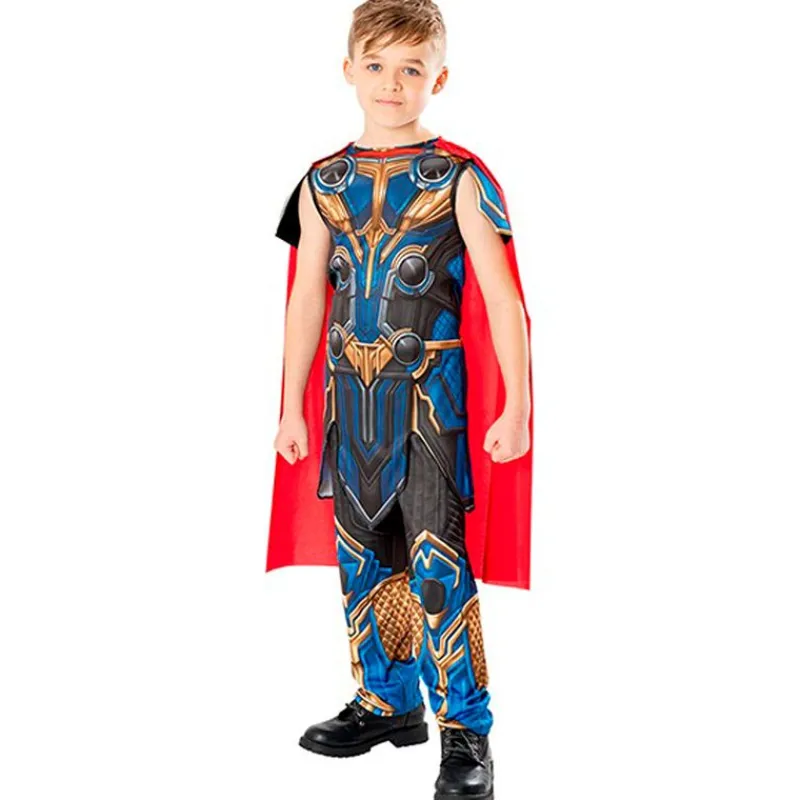 Disfraz infantil con diseños inspirados en Thor, como aparece en la película Thor: Love & Thunder. Se compone de una camiseta, unos pantalones y la capa. NO contiene calzado, ni peluca.