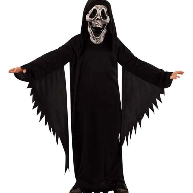 Disfraz compuesto de una larga túnica negra cortada en picos, una máscara de calavera y capucha.