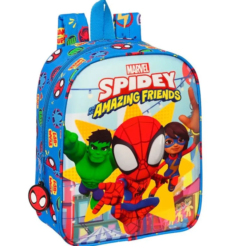 Mochila Guardería Spidey Team. Se compone de un único compartimento para que puedas guardar los accesorios escolares. Dispone de asa de mano en la parte superior y tarjeta de identificación personal. Adaptable a carro NO incluido. Sus dimensiones son de 22 cm x27 cm x 10 cm aproximadamente.