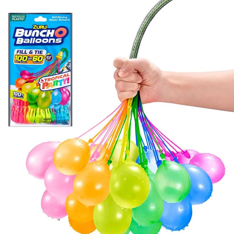 Pack con el que podrás llenar y atar 100 globos de agua en 60 segundos! Prepárate para la fiesta de globos más tropical de Bunch o Ballloons! Recomendado a partir de 3 años.