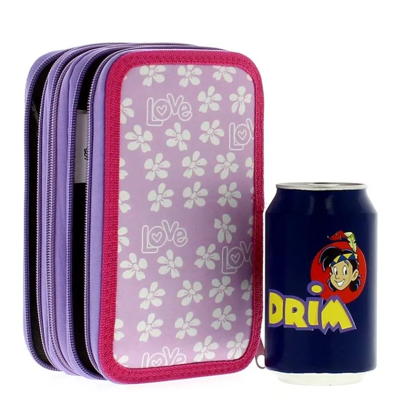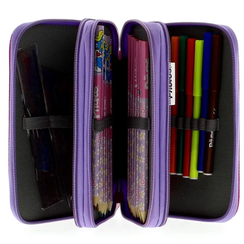 Bonito estuche en tonos rosados y lilas con diseños de la Pitufina, personaje de ‘Los Pitufos’. Completo estuche triple lleno en el que encontrarás complementos como 16 rotuladores, 15 lápices de diferentes colores, un par de reglas, un par de bolígrafos, lápiz, goma y sacapuntas. Recomendado a partir de 3 años.