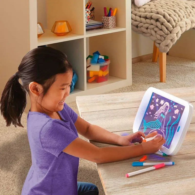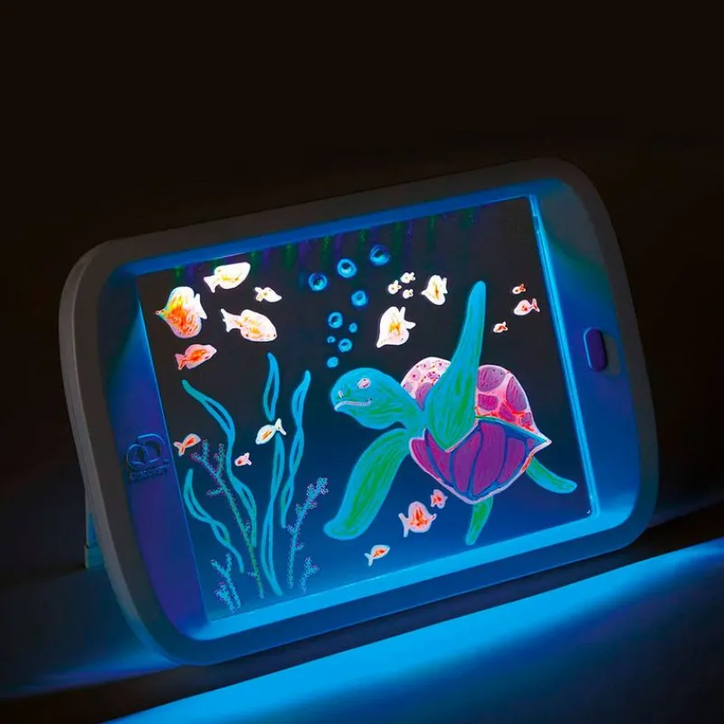 Pizarra mágica LED con 36 efectos de luz diferentes ¡Deja volar tu imaginación y dibuja con alucinantes colores! En el interior encontrarás 4 rotuladores. Funciona con 3 pilas AA NO incluidas. Recomendado a partir de 6 años.