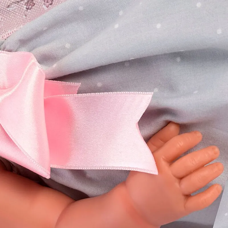 La cabeza, brazos y piernas de la muñeca están fabricadas en vinilo, pero su cuerpo es de tela de relleno de miraguano para que puedas colocarla en diferentes posiciones, como a los bebés de verdad.