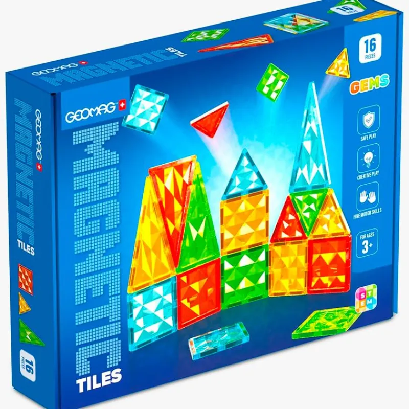 Pack de la colección Geomag Magnetic Tiles en el que encontrarás 16 piezas con las que liberar tu imaginación y hacer tus propias construcciones de diferentes formas y colores.