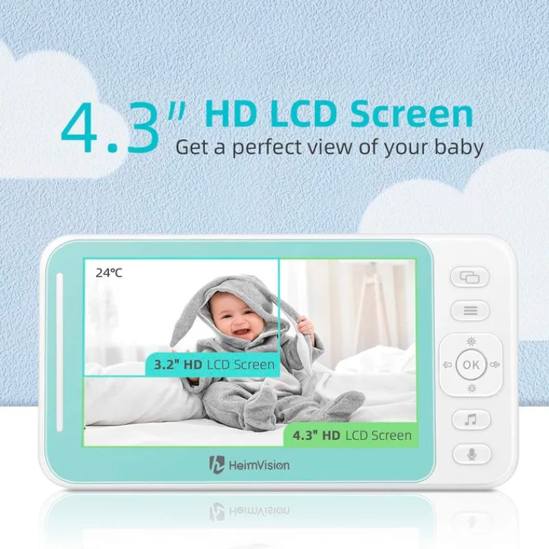 Vigilabebés HeimVision HM132 que dispone de cámara y audio, cámara de bebé de pantalla dividida de 4.3”, con visión nocturna, conversación de 2 vías, modo VOX, 8 canciones de cuna, lente adicional y soporte incluido. Este vigilabebés cuenta con conversación bidireccional y comunicación a tiempo real, con micrófono y parlantes ultra utilitarios, cuando no puedas estar cerca de tu bebé, podrás comunicarte con él con tu propia voz para consolarlo y relajarlo. Tiene reloj recordatorio de alimentación, si tienes algún plan de alimentación para tu bebé puedes añadir el recordatorio. Su función de pantalla dividida permite ver dos habitaciones en un segundo, también permite escuchar en este modo, admite máximo 2 cámaras. El receptor funciona enchufado a la luz o con pilas.