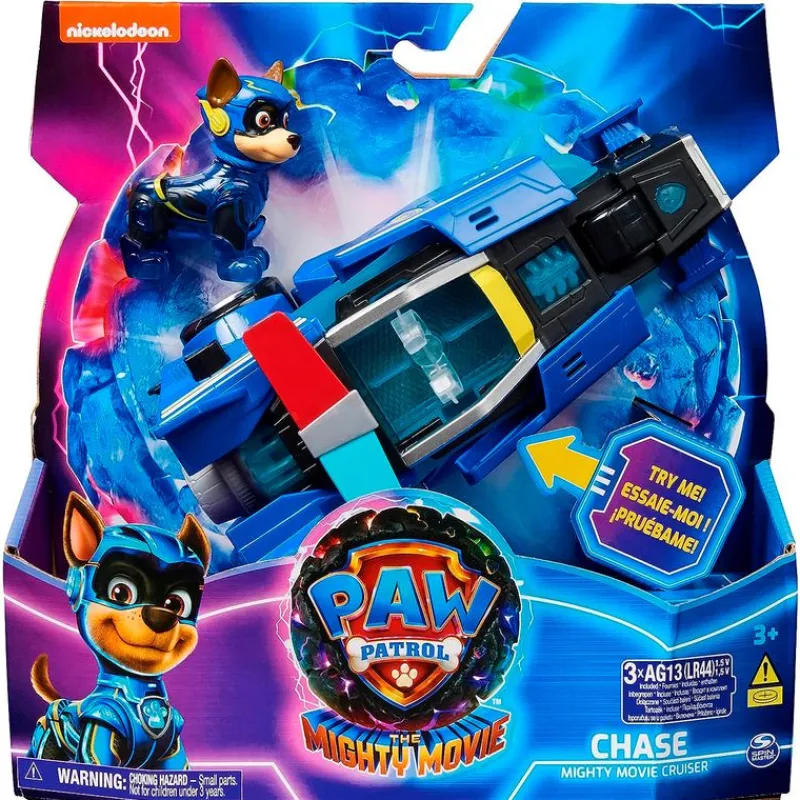 Vehículo inspirado en la película de animación Patrulla Canina Mighty Movie. Viene acompañado de Chase. Con partes translúcidas que se iluminan cuando el cachorrito se encuentra en el vehículo. Funciona con 3 pilas LR44 incluidas (pilas de demostración). Recomendado a partir de 3 años
