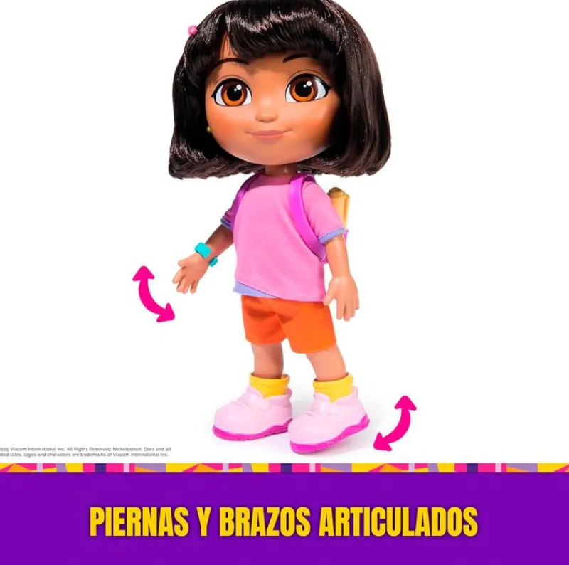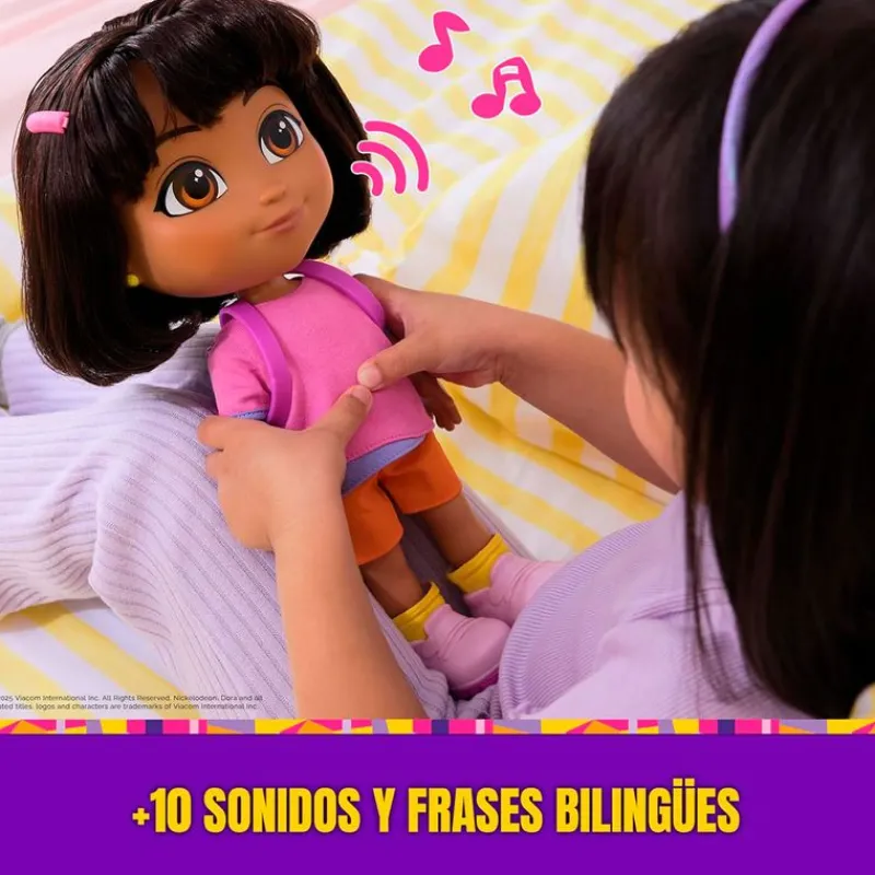Dora habla tanto en español como en inglés, aportando un toque educativo mientras invita a bailar, cantar y participar en el juego.