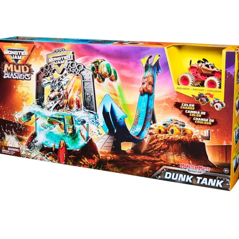 Contiene un vehículo Monster Jam, una rampa de lanzamiento, un tanque de inmersión, un recipiente de barro para agua fría, una hoja de calcomanías y las instrucciones.